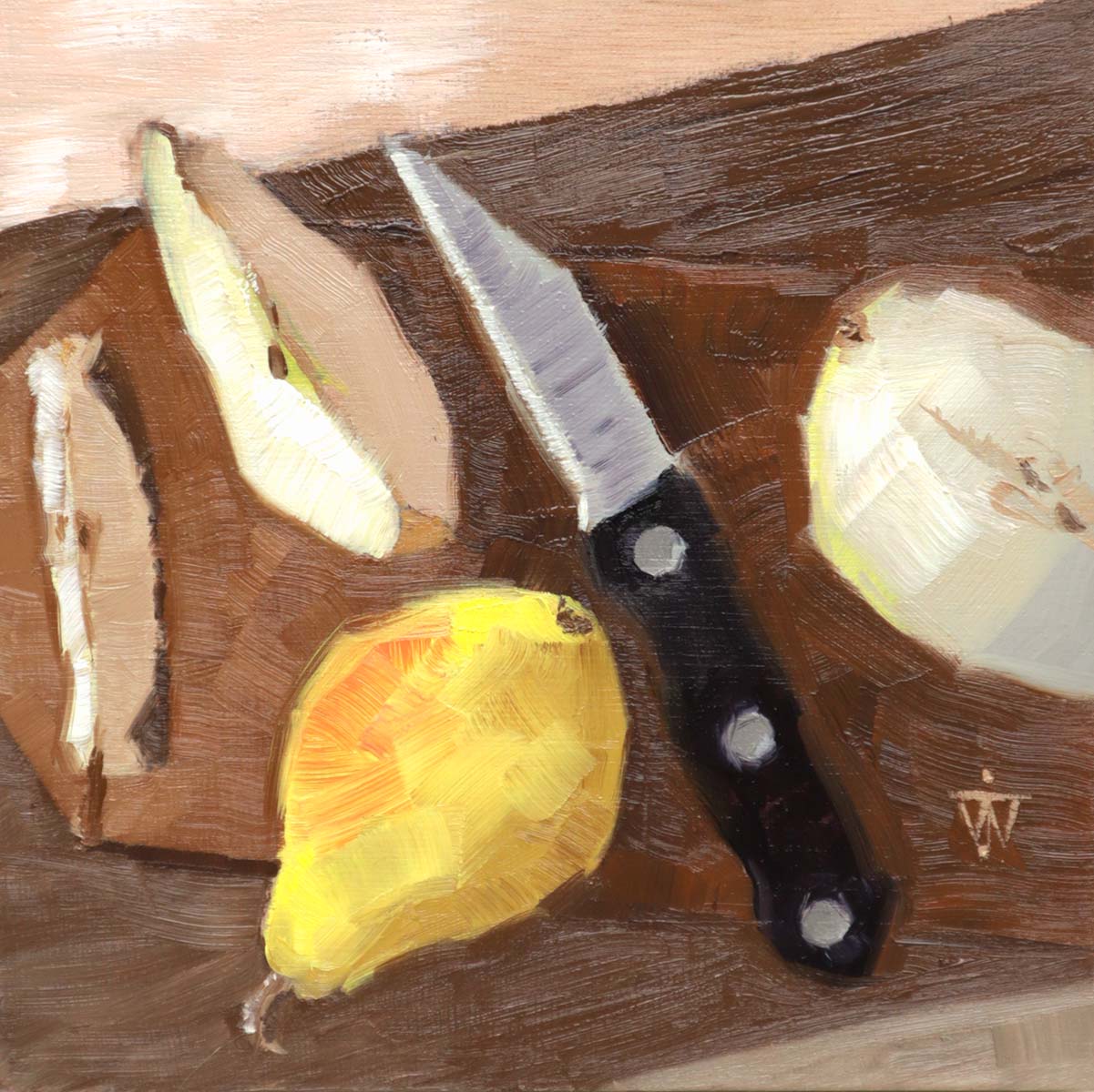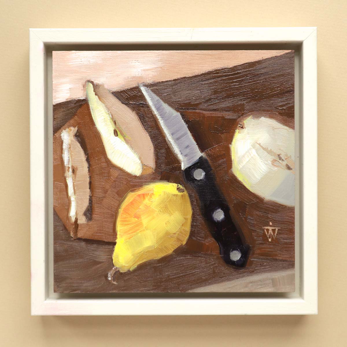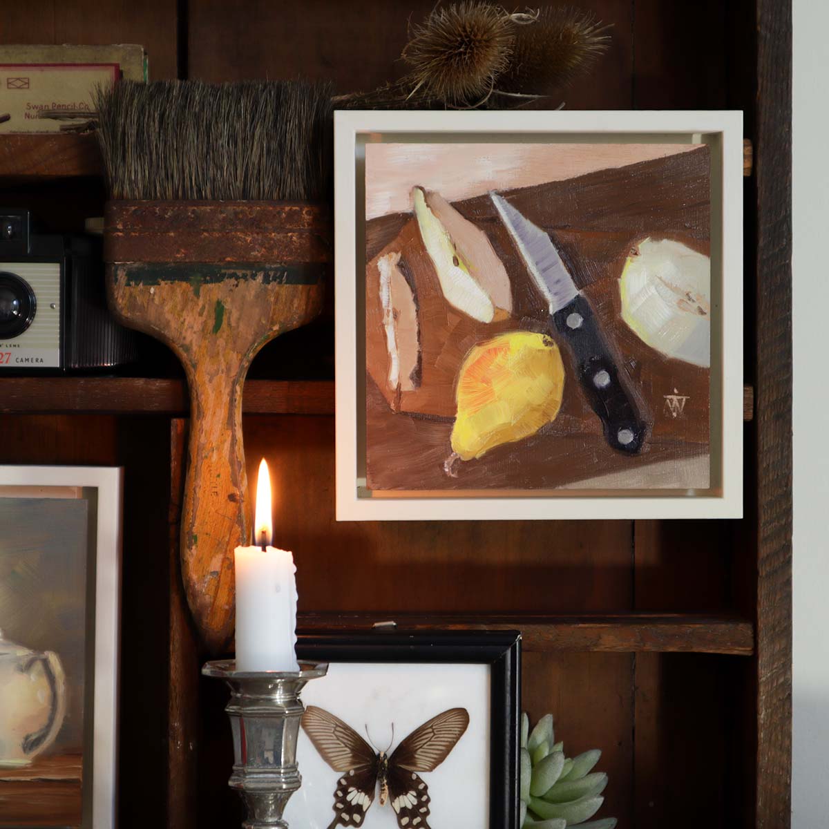 This charming little painting captures all of that kitchen warmth and nostalgia. The golden pear slices on weathered wood remind us that the most beautiful moments are often the simplest ones - just fresh fruit, a proper cuppa, and that sense of unhurried care.