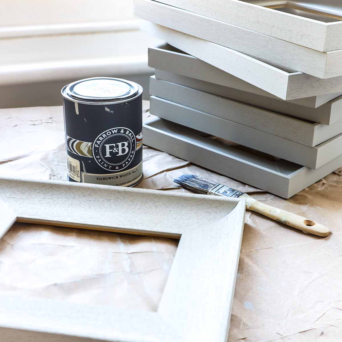 Custom-made wooden frames, hand-finished in my studio with Farrow & Ball paint (typically Hardwick White, a sophisticated grey-white) and sealed with beeswax. Precision-crafted frames that allow the painting to 'float.'