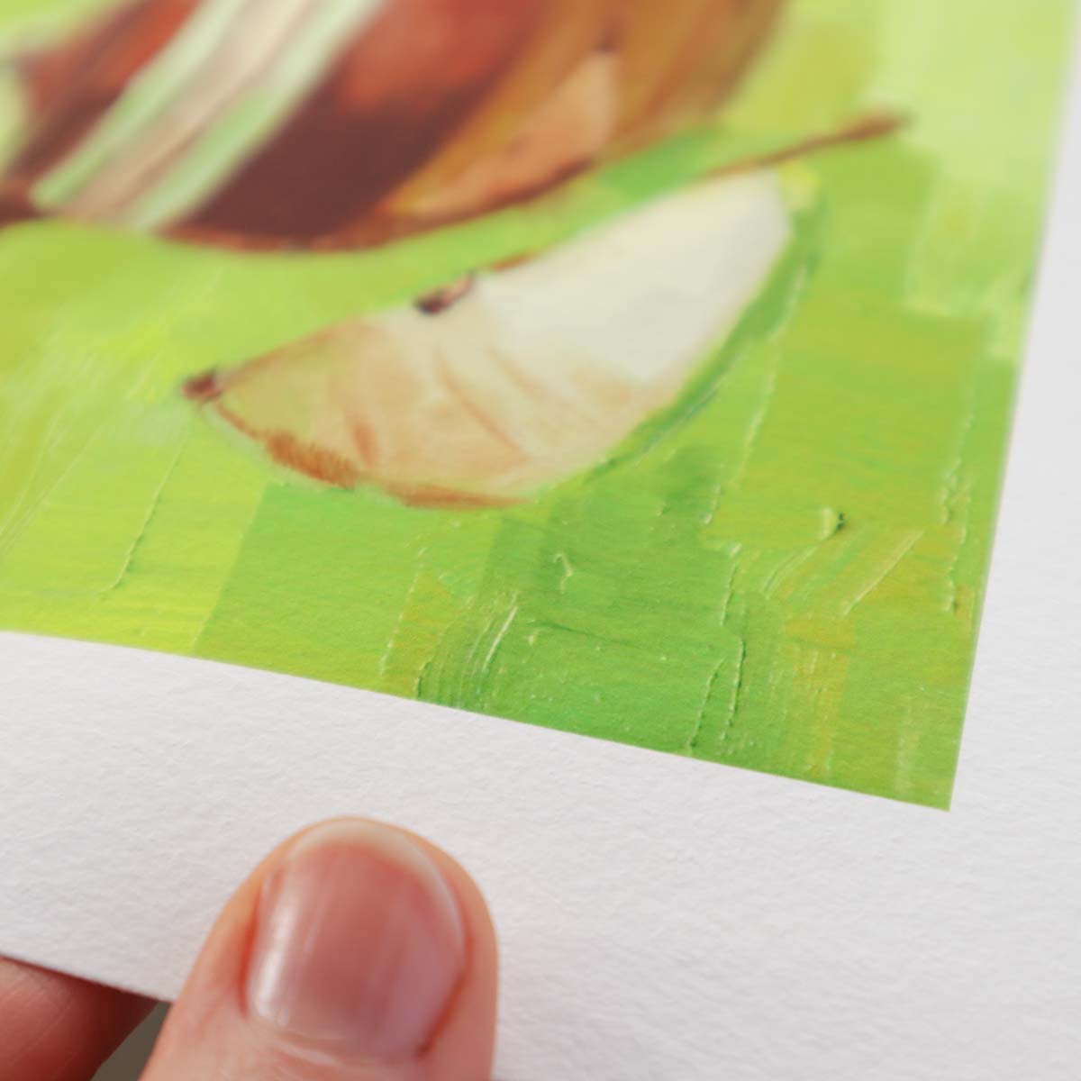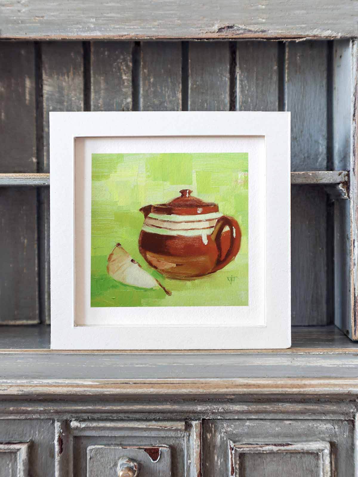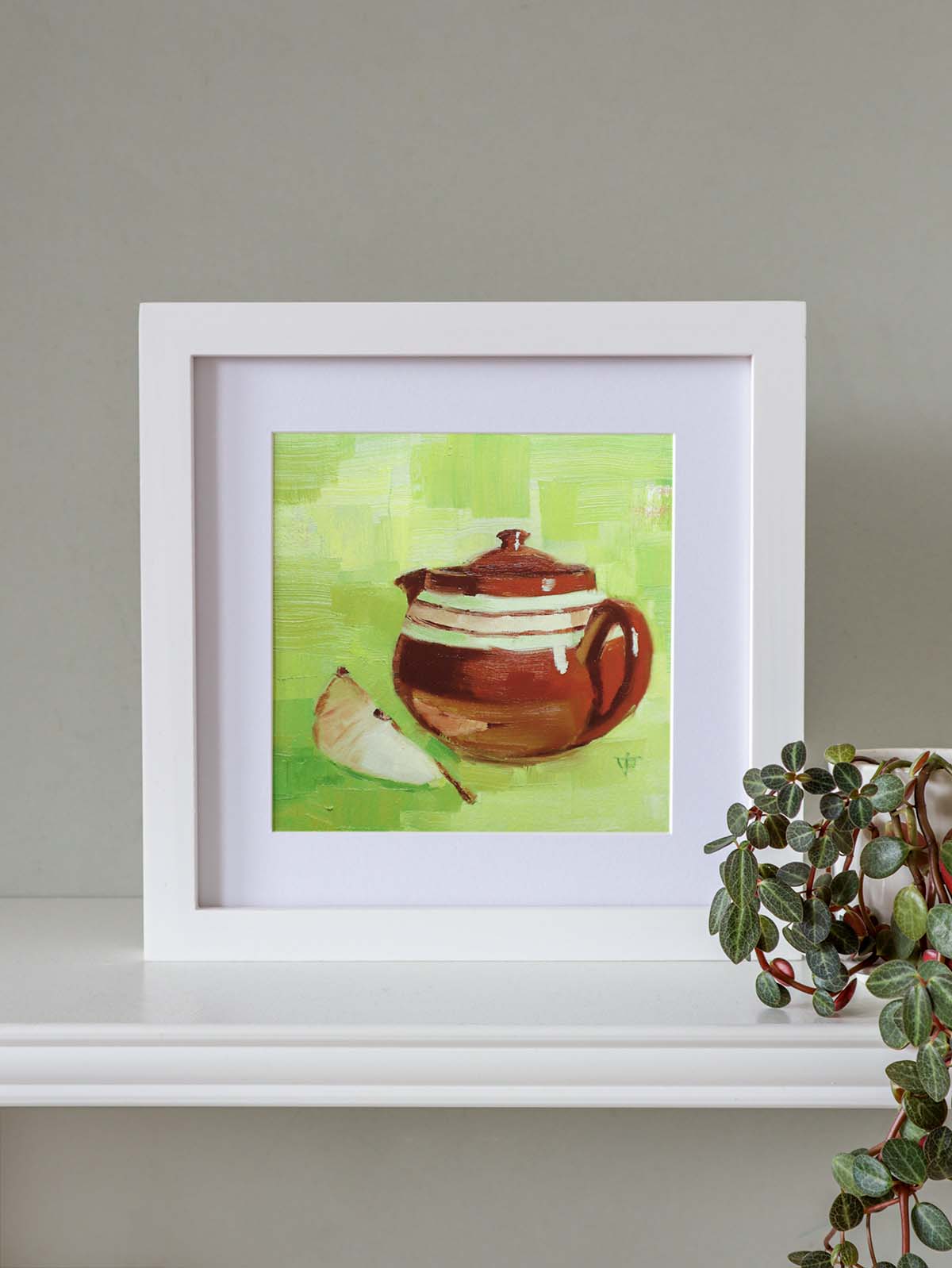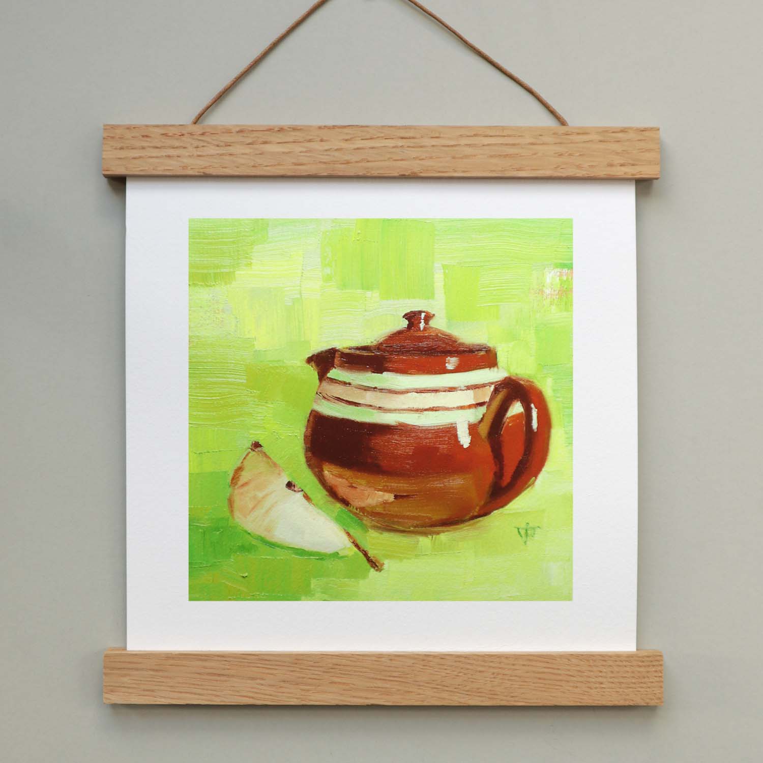 This cheerful teapot print brings that cosy morning feeling to your walls. The vintage brown teapot with its bright green background and little pear creates an instant sense of warmth and comfort - like having a visual reminder of your favourite teatime ritual always within sight.
