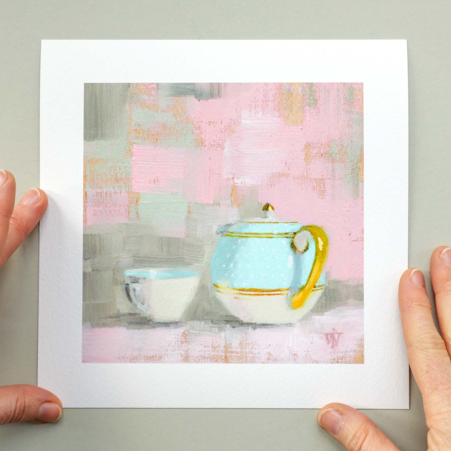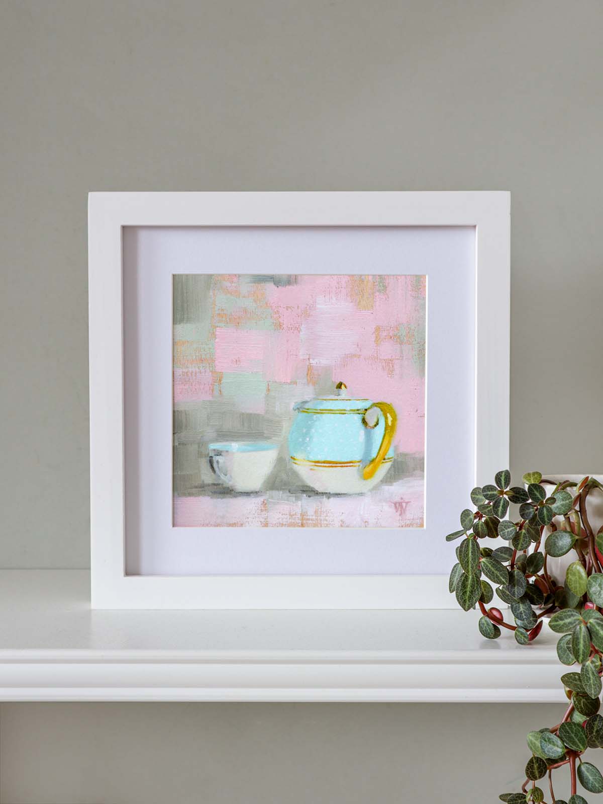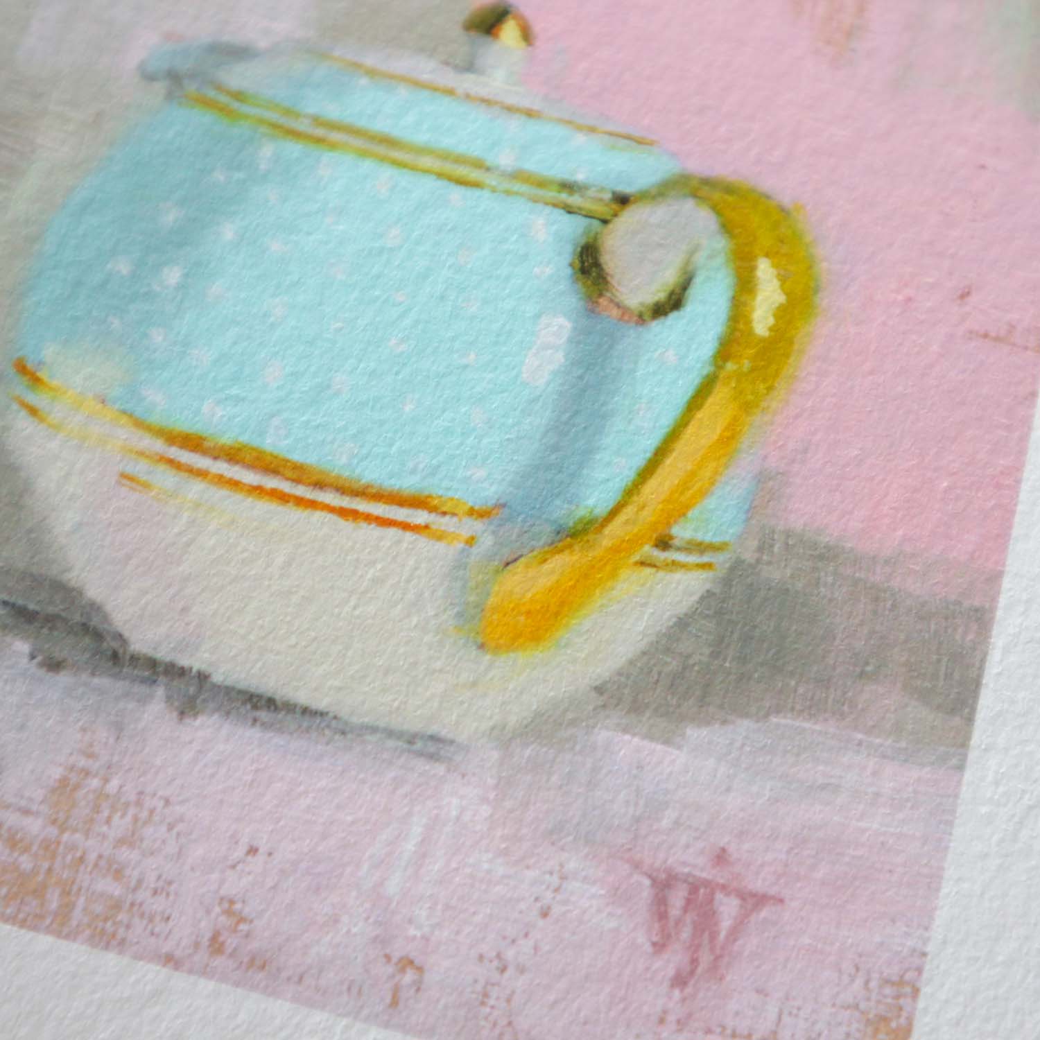 Those soft pastels and bright turquoise bring a gentle smile to any room, creating that lovely warm feeling without overwhelming the space. This charming print works beautifully in kitchens, breakfast nooks, or anywhere you enjoy your tea ritual - bringing a touch of Sunday elegance to everyday moments.