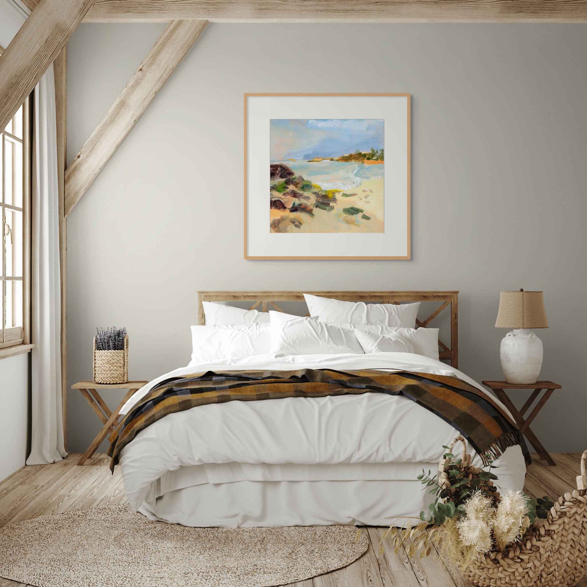 I painted this in my studio, recalling quiet walks along the shoreline. The loose brushstrokes and sun-warmed colours invite you to step into the scene — you can almost hear the waves and feel the sea breeze.
