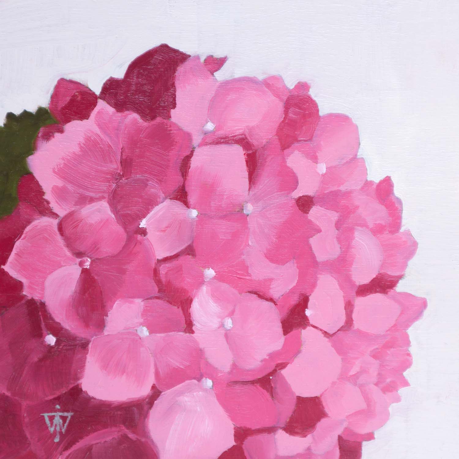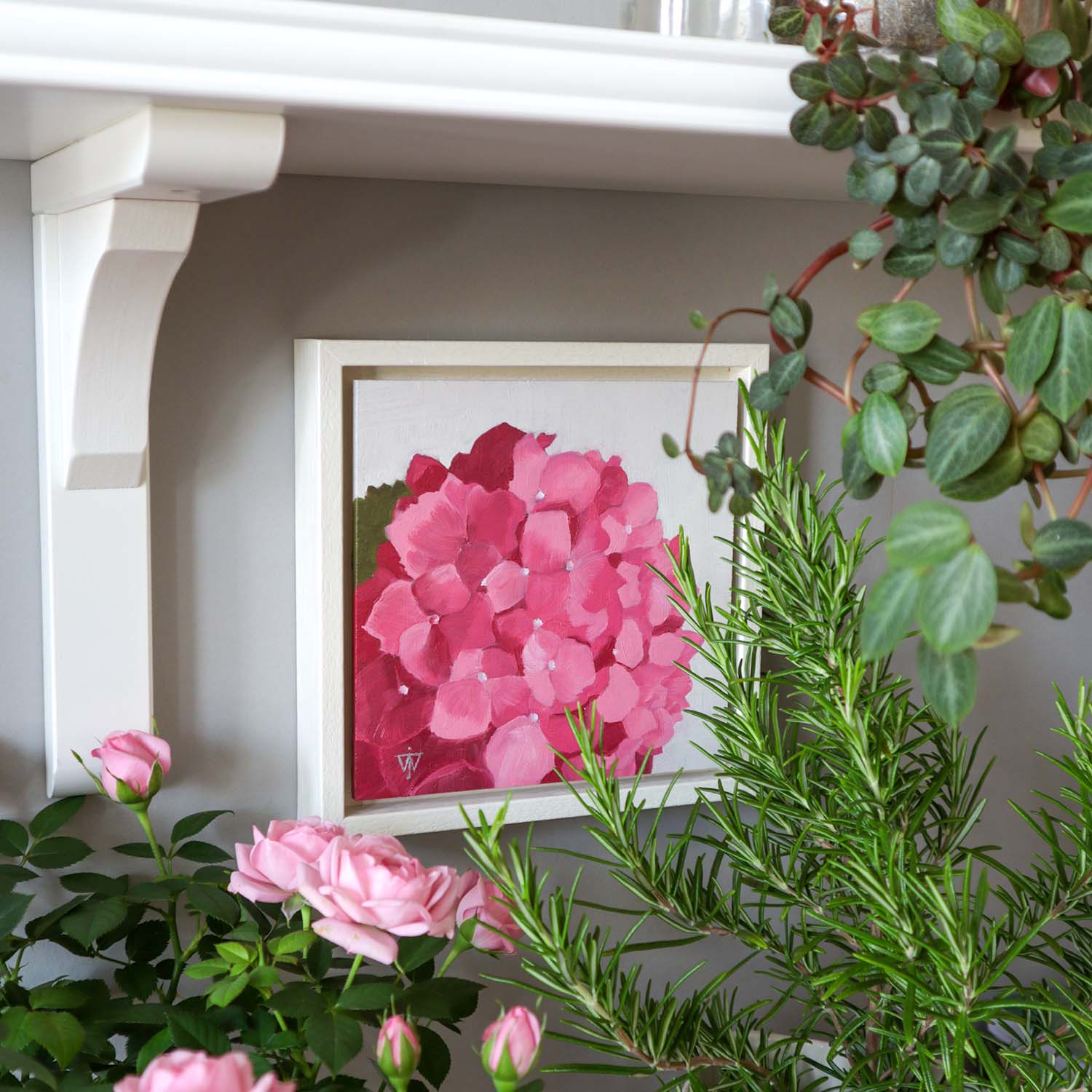 This small oil painting brings gentle warmth to any space. The soft pink hydrangea against white looks beautiful on a dark fireplace mantle, kitchen windowsill, or nestled between books on your living room shelf. Perfect botanical wall art for those moments when you need just a sprinkle of something lovely.