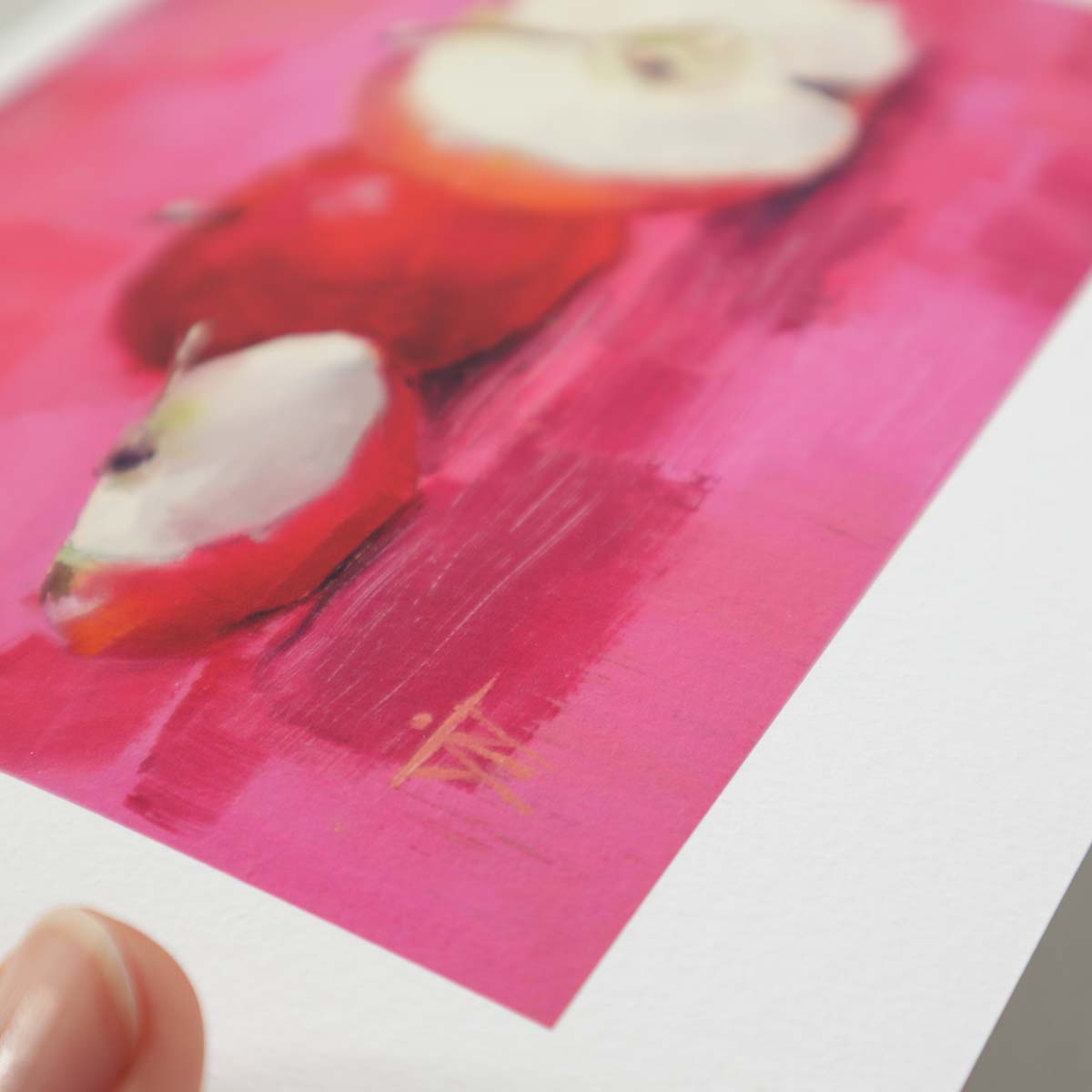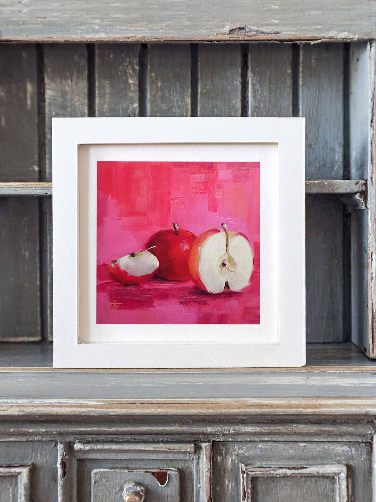 There's something magical about the simple pleasure of fresh fruit and vibrant colour that instantly lifts the spirit. This small kitchen wall art print captures that feeling perfectly - brilliant red apples against a cheerful pink background that radiates warmth and joy.
